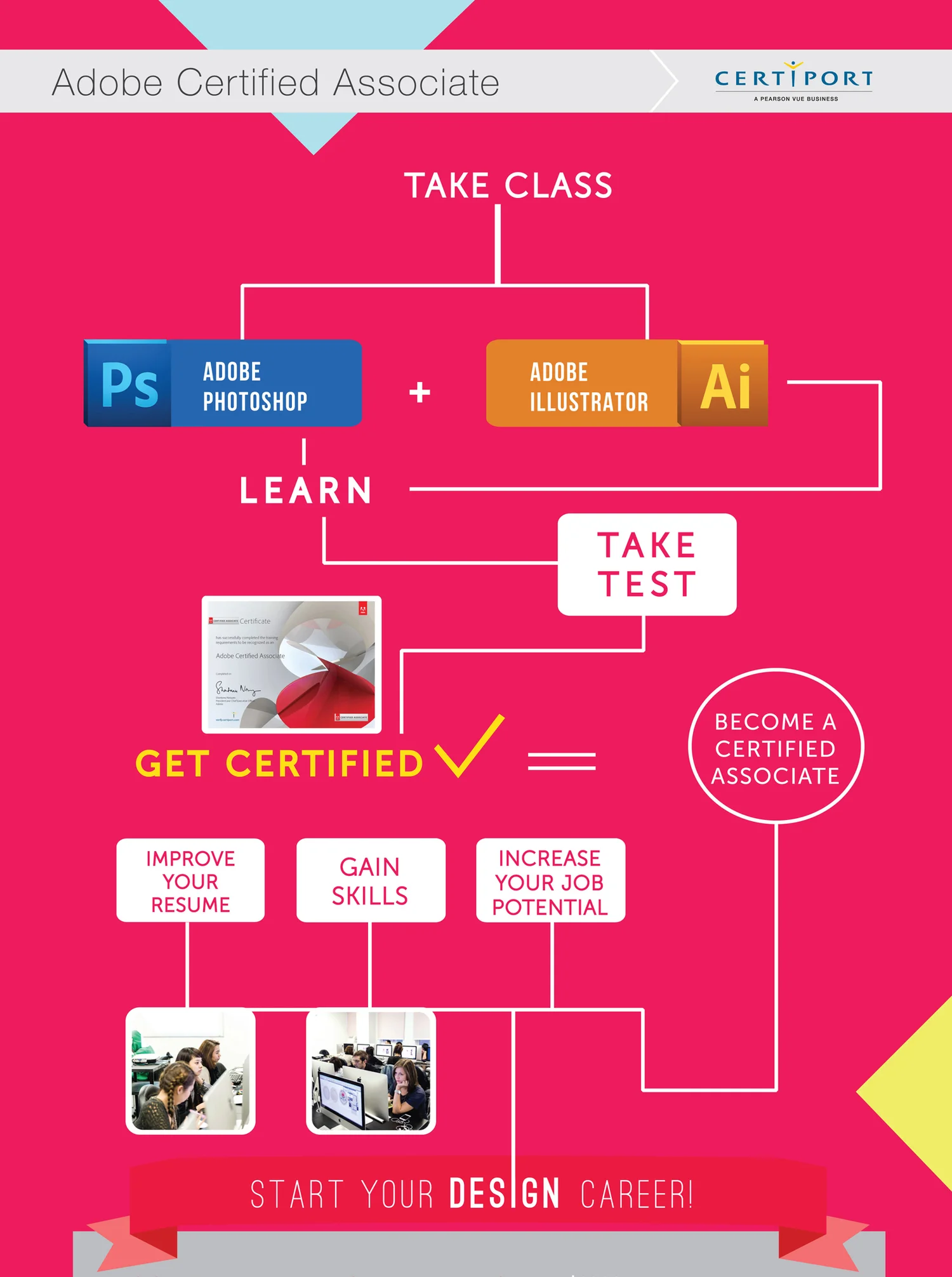 このコースでは、Adobe PhotoshopとIllustratorの基礎的な使い方から応用まで学ぶと共に、Adobe Certificate取得を最終目的とするクラスが組まれています。新規の方は14週間(PhotoshopとIllustrator両方)から、すでにPIの学生なら7週間(PhotoshopもしくはIllustrator)、もしくは14週間からなるプログラムで、全くの初心者から始められます。そして、Adobe PhotoshopとIllustratorの公式取得証明書を取得できれば、スキルとして、履歴書に書き加えたり、仕事、就職をする際にとても役に立ちます。