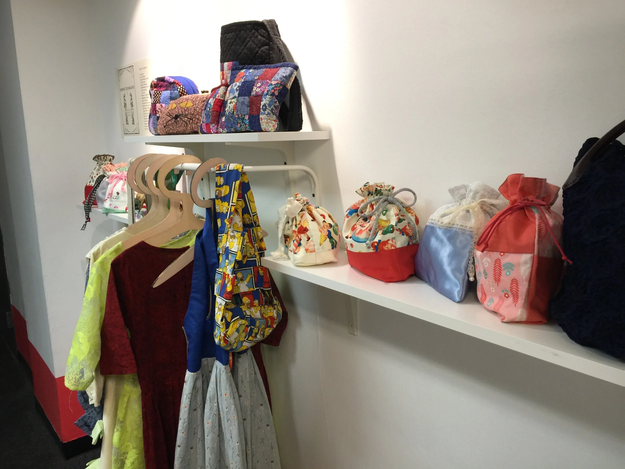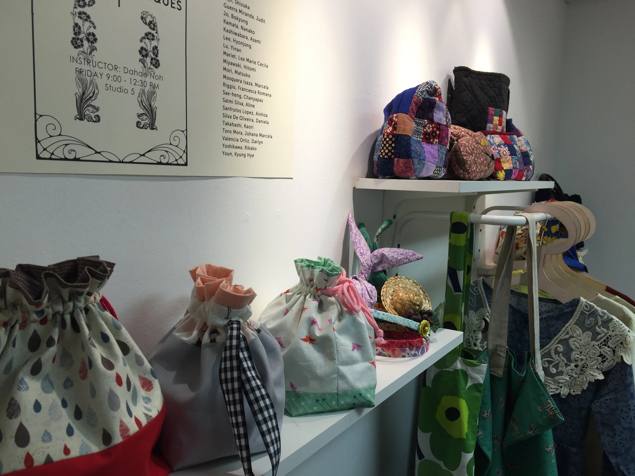 先週、第2期春セメスターも終わり、それに伴いIntroコース(一般教育コース)のSilk Screen PrintingとSewing Techniqueの授業で制作した作品が本校の展示スペースにて展示されました。